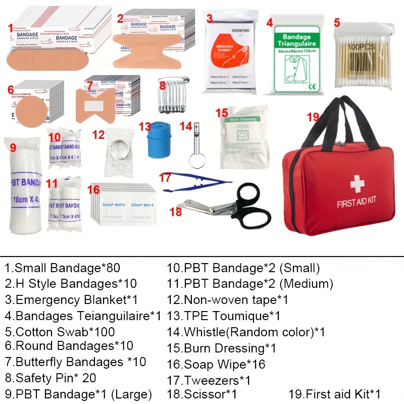 Deluxe 260pcs First Aid Kit - Essential Safety Supplies for Home, Outdoor Adventures & Camping - Portable with Scissors, Bandages, Tweezers - Red, No Magnesium Rod/Flint