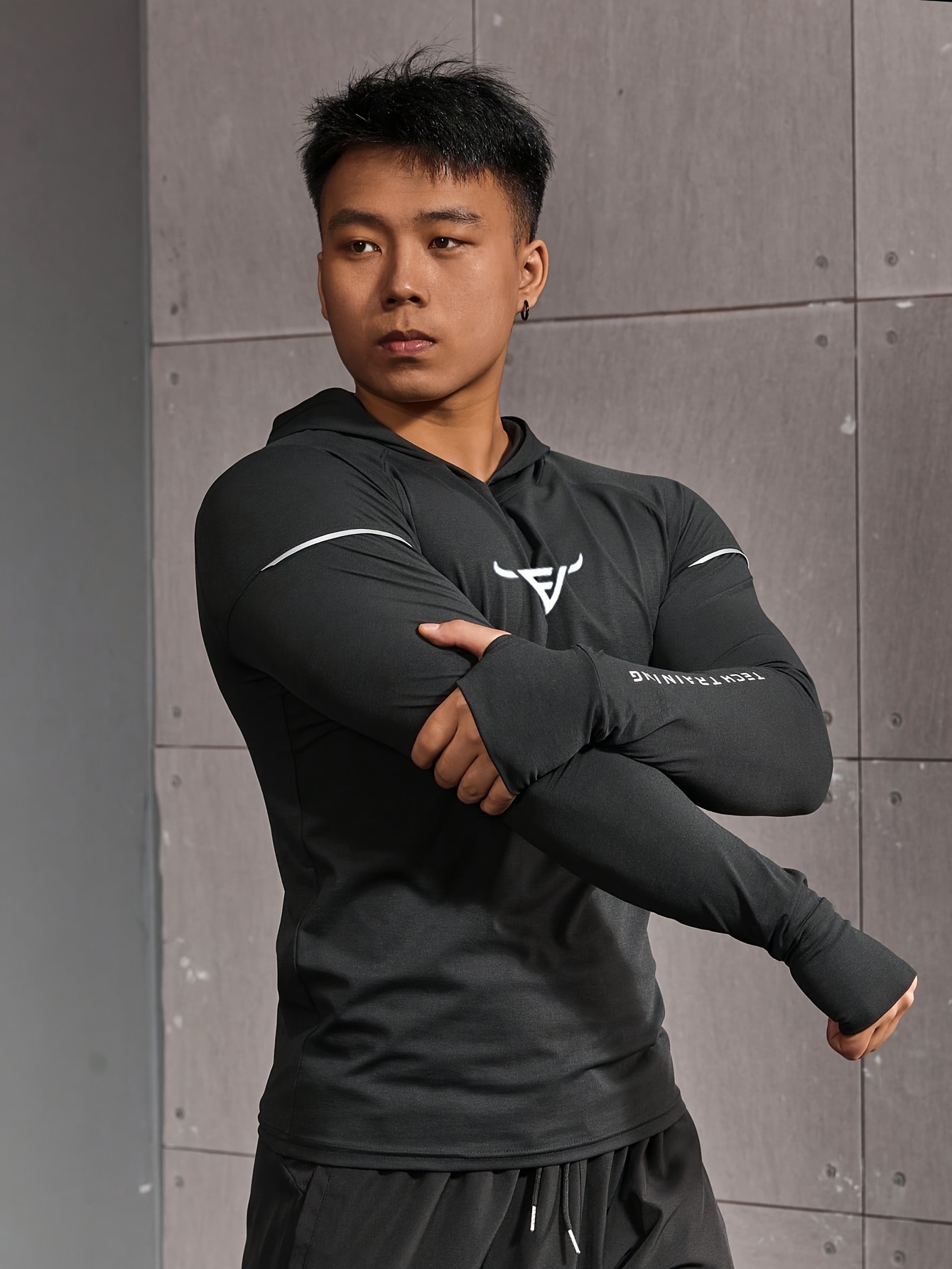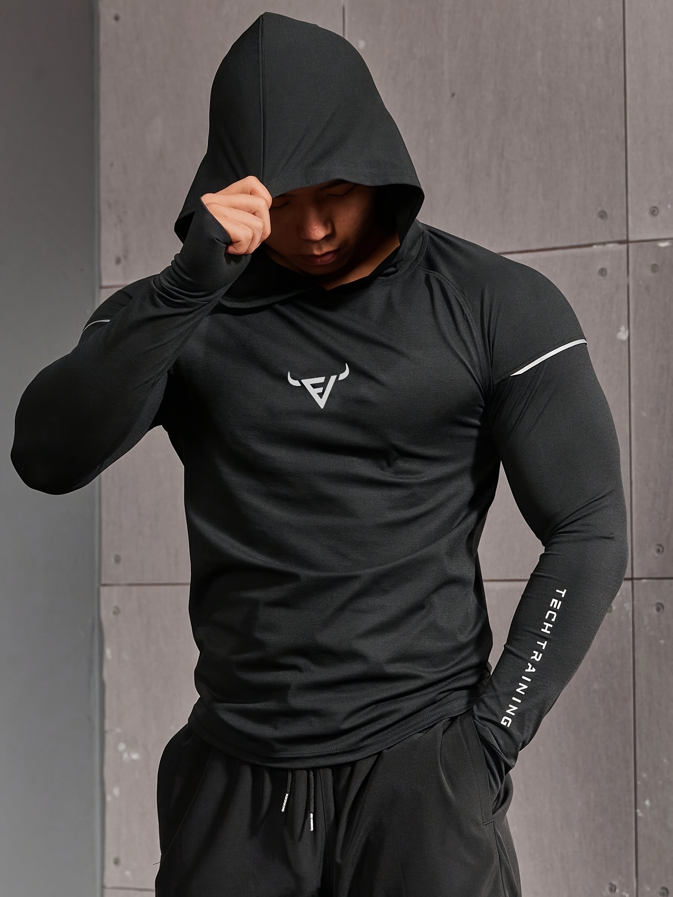 Haut d’entraînement homme à capuche, manches longues slim-fit avec passages pour pouces, tissu respirant et léger, idéal pour course et musculation.