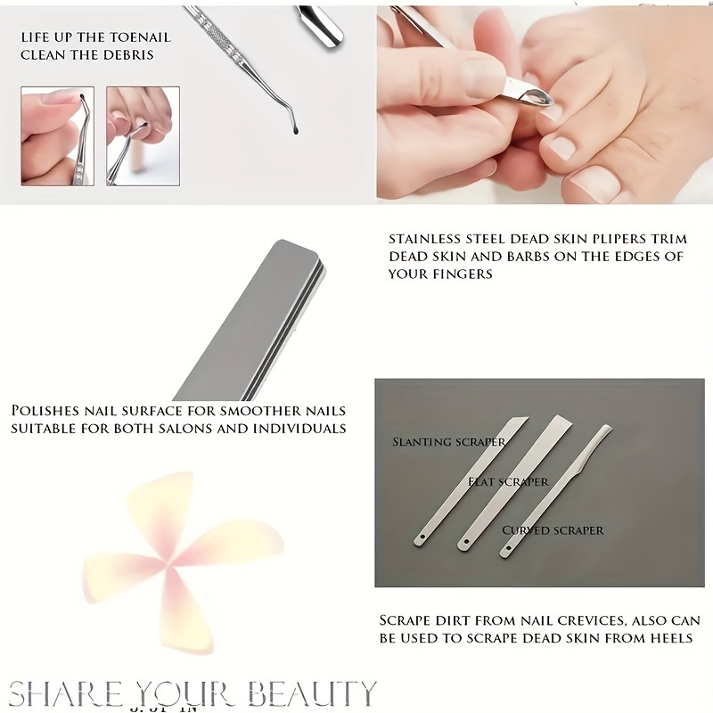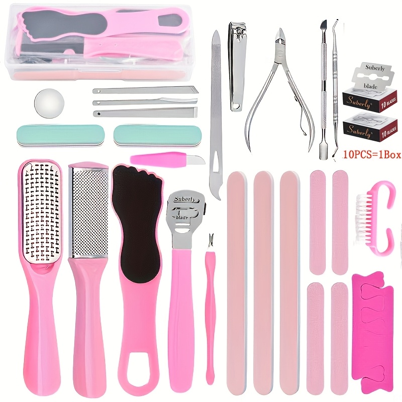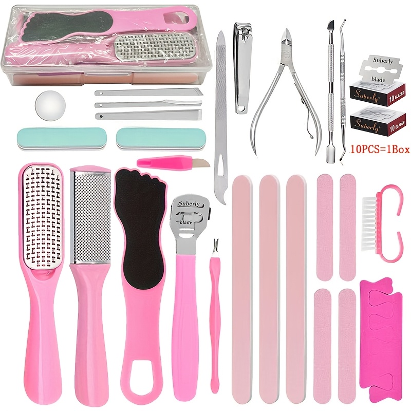 Set pédicure 47 pièces rose avec étui, soins professionnels, 20 lames remplaçables, pousse-cuticules, râpe callosités, acier inoxydable, plastique sans parfum, voyage.