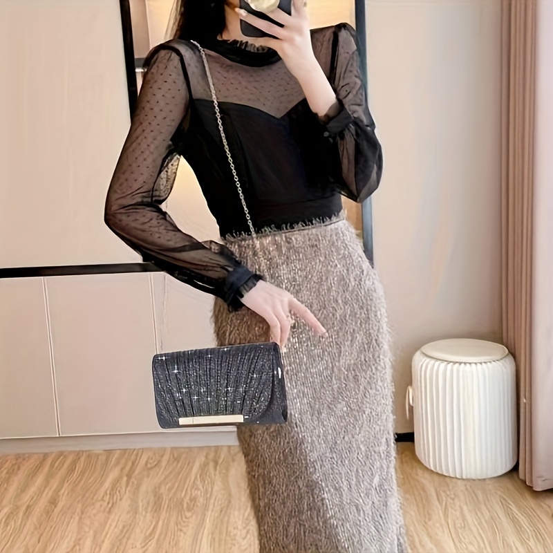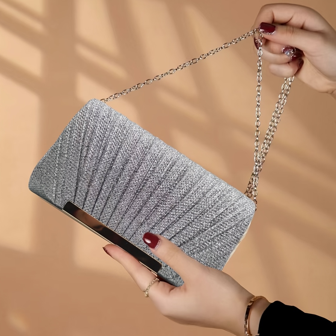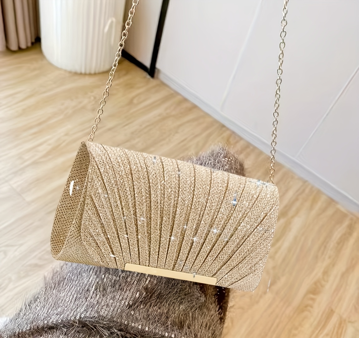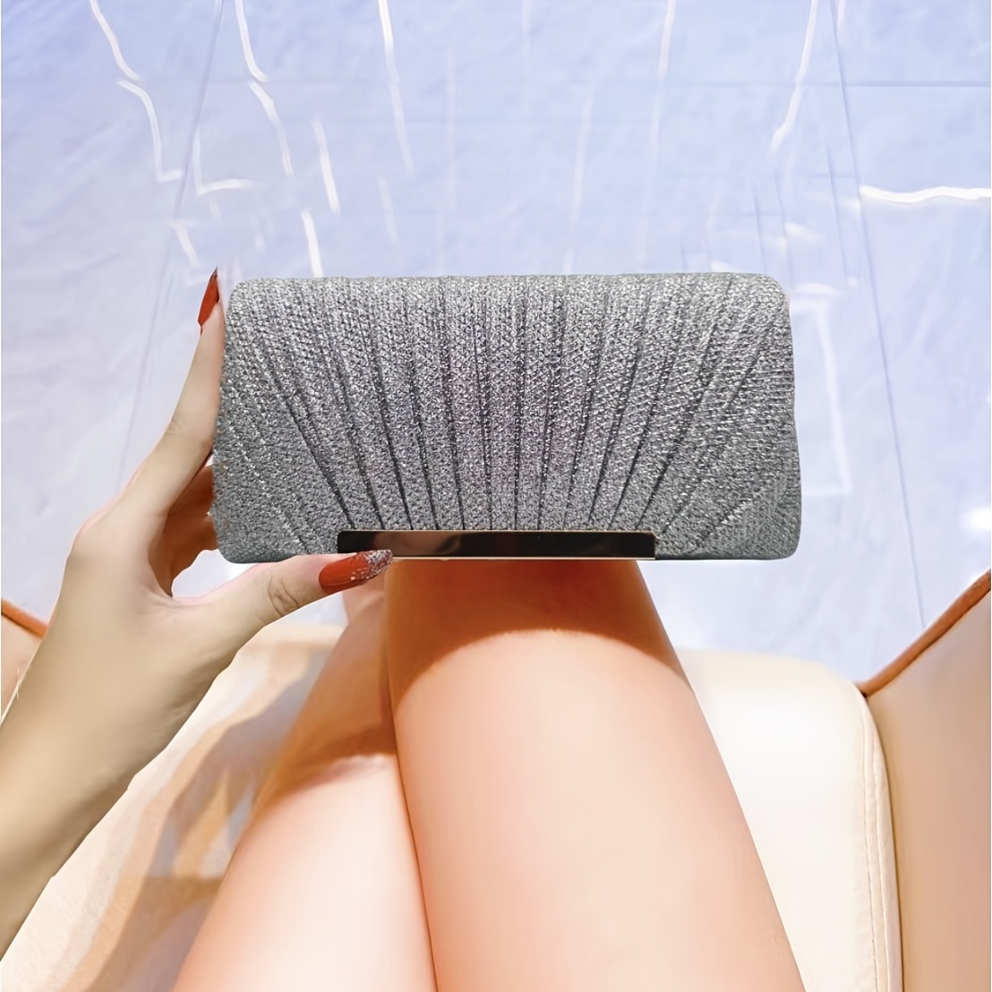 Sac enveloppe de soirée plissé et brillant, élégant, idéal pour mariages, soirées dansantes et banquets formels.
