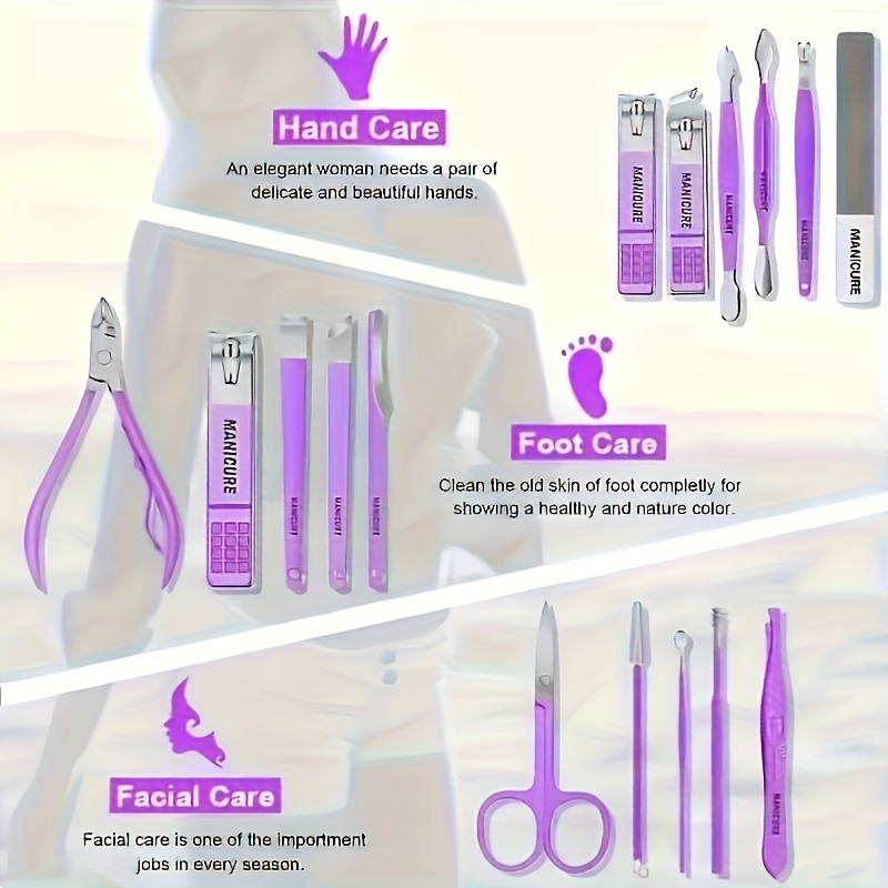 Set 16 pièces soins des ongles en acier inoxydable, lime, cure-oreille et ciseaux, style moderne, idéal voyage et usage professionnel.