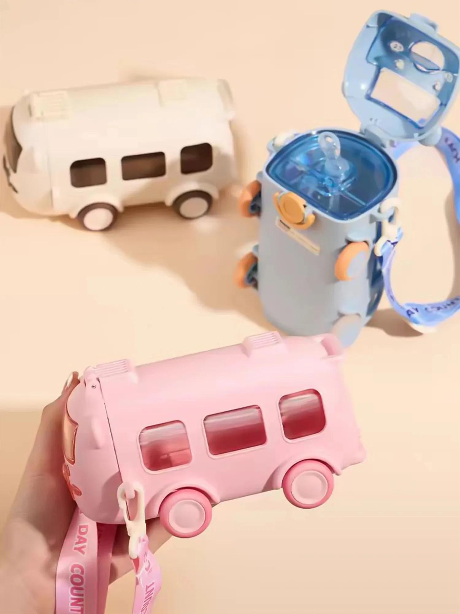 Gourde isotherme en forme de bus, 500 ml, paille et sangle, réutilisable en polycarbonate, à laver à la main.